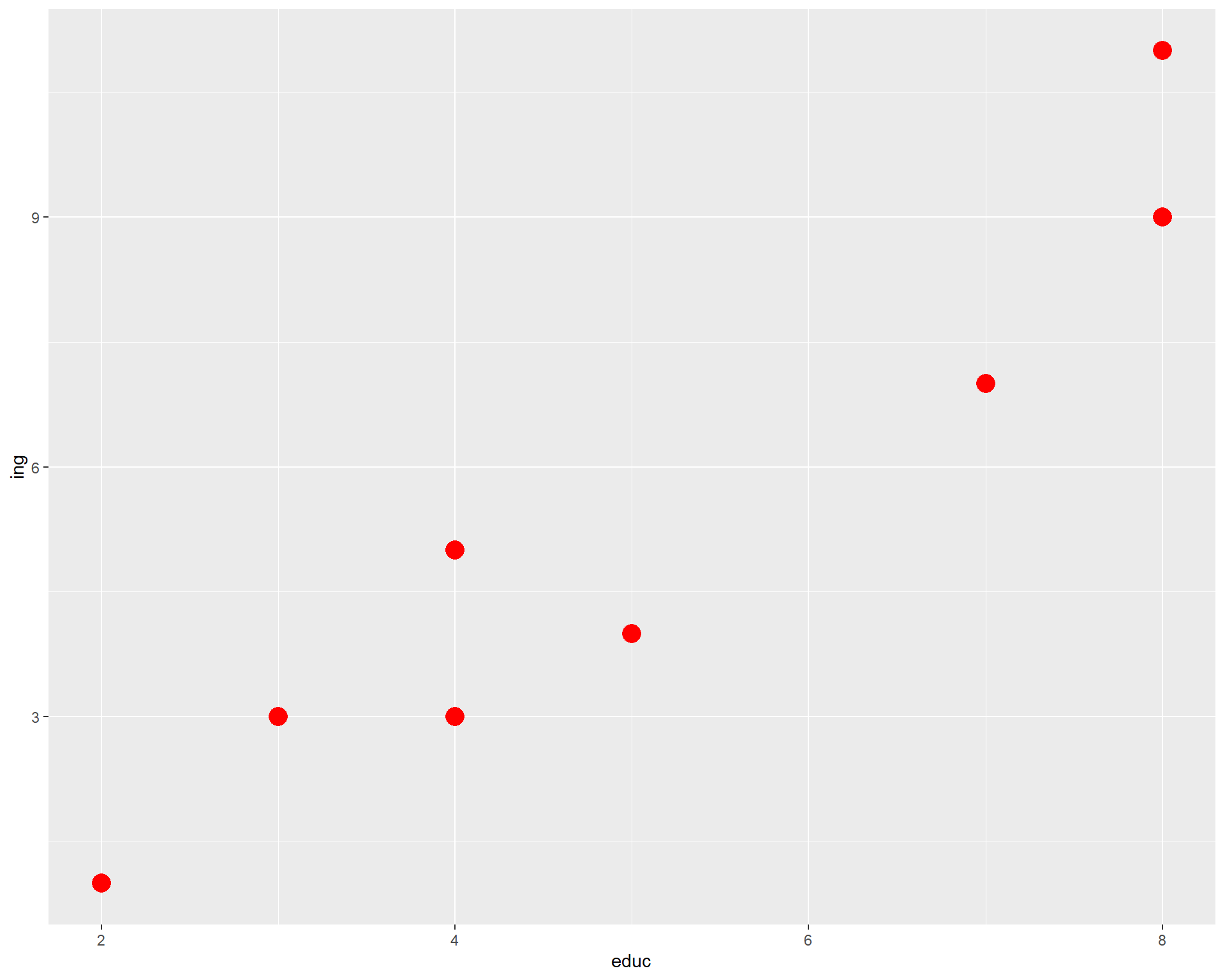 En este caso, un valor de 0.95 es muy alto, y significa que las variables ingreso y educación, en nuestra base de datos simulada, se encuentran fuertemente correlacionadas.