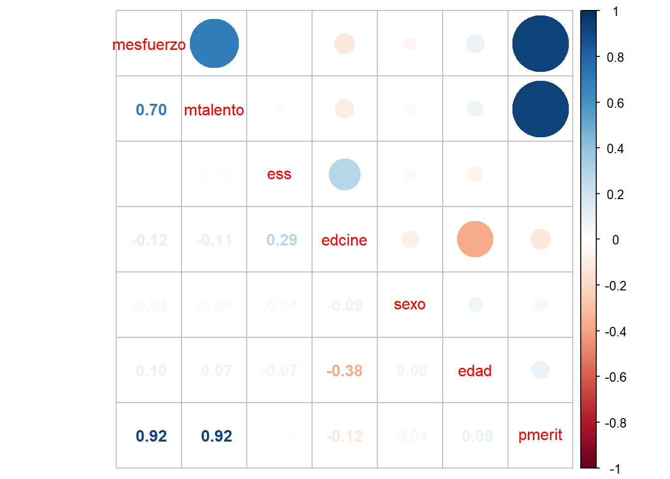 triangle = "lower")| Recompensa: esfuerzo | Recompensa: talento | Estatus Social Subjetivo | Educación | Sexo | Edad | Meritocracia promedio | |