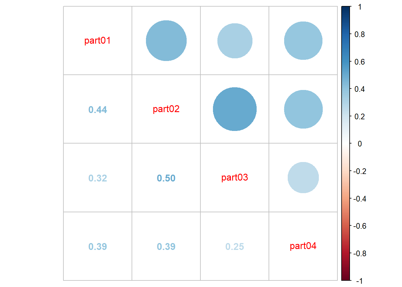 corrplot.mixed(cor(select(elsoc,part01,part02,part03,part04),